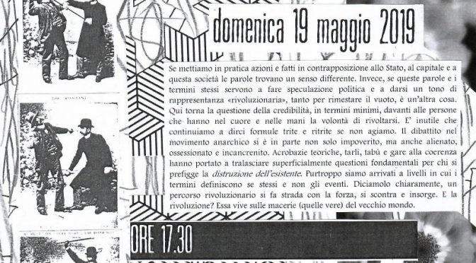 Se mettiamo in pratica azioni e fatti in contrapposizione allo Stato, al capitale e a questa società le parole trovano un senso differente. Invece, se queste parole e i termini stessi servono a fare speculazione politica e a darsi un tono di rappresentanza «rivoluzionaria», tanto per rimestare il vuoto, è un’altra cosa. Qui torna la questione della credibilità, in termini minimi, davanti alle persone che hanno nel cuore e nelle mani la volontà di rivoltarsi. È inutile che continuiamo a dirci formule trite e ritrite se non agiamo. Il dibattito nel movimento anarchico si è in parte non solo impoverito, ma anche alienato, ossessionato e incancrenito.
